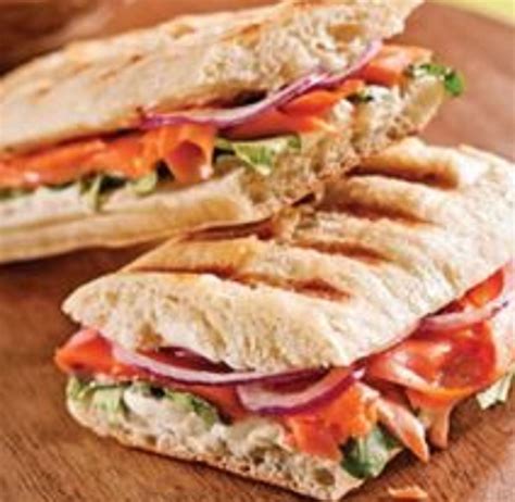 - Ingrédients : Pain panini, poulet grillé, poivrons rouges et jaunes, oignons rouges, sauce pesto, huile d'olive, sel et poivre.